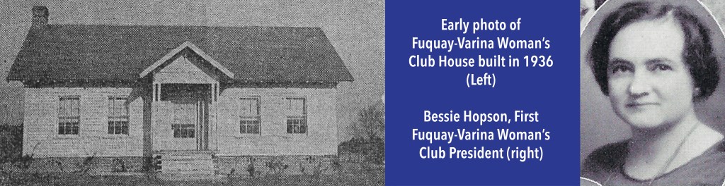 In 1926, eight women, all of whom lived on the “Varina” area, met and organized themselves in the home of Ms. Bessie Hopson. Shortly thereafter, they moved into a rented room in the Judd Building on Broad Street. They called themselves the “Varina Woman’s Club” and elected Mrs. Hopson as their president and adopted their motto, “Service.” In 1951 it officially became the Fuquay-Varina Woman’s Club, long before the town adopted the change in 1963. Women from both areas had been members over the years.
